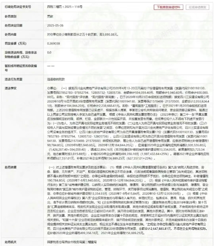 The company involved in the case, Chang'an International Trust Co., Ltd., accepted 17 value-added tax special invoices issued by Sichuan Jinguang Real Estate Appraisal Co., Ltd., with a total value and tax of 600,000 yuan, and declared the input tax deduction amount; Received 3 VAT special invoices issued by Sichuan Sanshi Construction Co., Ltd., with a total value and tax of 2.2386 million yuan, and declared the input tax deduction. The above 20 VAT special invoices have been confirmed to be falsely issued. The tax authorities have based on evidence such as the interrogation records made by the parties Fu and Li at the public security organs, as well as the return of funds, It was determined that the company involved in the case, knowing that there was no real business with Sichuan Jinguang Real Estate Appraisal Co., Ltd. and Sichuan Sanshi Construction Co., Ltd., allowed the issuing party to issue value-added tax special invoices for itself and declare tax deductions, which constituted the act of letting others issue false value-added tax special invoices for themselves. The amount of value-added tax that should be transferred out as input tax is 190,700 yuan, and the amount of corporate income tax paid from 2020 to 2021 is 656,300 yuan.