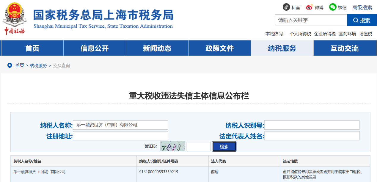 The Fifth Inspection Bureau of the Shanghai Municipal Taxation Authority of the State Administration of Taxation found that the company involved in the case, Tianyi Financing Leasing (China) Co., Ltd., mainly has the following problems: Issued 150 value-added tax special invoices for others (for oneself), with an amount of 147.6917 million yuan and a tax amount of 25.1076 million yuan. In accordance with the "Tax Collection and Administration Law" and other laws and regulations, the tax authorities will transfer the case to the judicial authorities in accordance with the law.