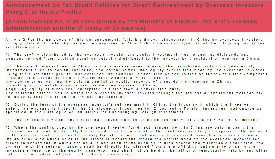 Editor’s Note: According to data from the Ministry of Commerce, more than 70,000 new foreign-invested enterprises were established in China in 2025, representing a year-on-year increase of 19.1%. The continuous increase in foreign investment in China is largely attributable to supportive tax policies. Since 2017, China has established a deferred tax regime for overseas investors making direct investments with distributed profits. *The Notice on Expanding the Scope of the Policy of Temporary Exemption from Withholding Income Tax on Direct Reinvestment by Overseas Investors with Distributed Profits* (Cai Shui [2018] No. 102) extended the application of tax deferral from encouraged foreign investment projects to all non-prohibited foreign investment projects and sectors. *The Announcement on Tax Credit Policies for Direct Reinvestment by Overseas Investors Using Distributed Profits* (Announcement No. 2 of 2025 jointly issued by the Ministry of Finance, the State Taxation Administration and the Ministry of Commerce), released last year, further added tax credit incentives on the basis of the deferred tax system. This marks a leap forward in tax policies for foreign investors' reinvestment, evolving from "tax deferral" to "tax reduction", which is of great significance for easing the burden on foreign investors, improving operational quality and efficiency, and boosting their investment enthusiasm. Based on two cases of supplementary tax payment arising from overseas investors' reinvestment, this paper explores the core application requirements of the deferred tax policy, interprets the key points of the new tax credit policy, and provides practical references for overseas investors to enjoy tax incentives in a compliant manner.