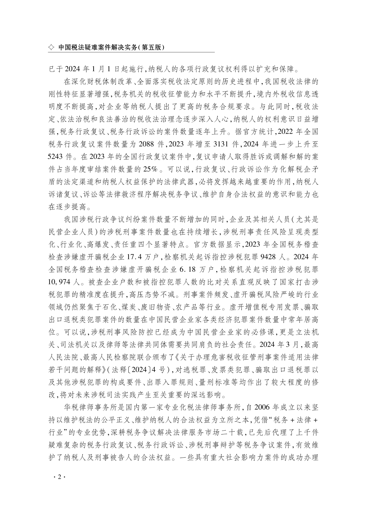 Legal Practice Of China Difficult Tax Cases (Fifth Edition) retains only a small portion of cases from the fourth edition and adds 19 new typical cases handled by the Huashui team in the past three years. These include two new Corporate Income Tax cases, two new Individual Income Tax cases, four new cases on tax issues in corporate bankruptcy, three new cases in foreign trade, two new cases in the petrochemical industry, two new cases in renewable resources and steel, two new cases in real estate, and one new case each in the coal and agricultural products industries.