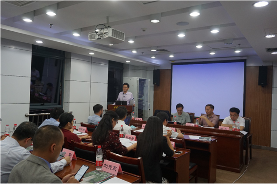 The picture shows Secretary-General Han Xiutao delivering a speech