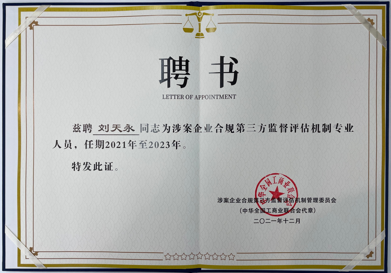 Lawyer Liu Tianyong, Director of Hwuason Law Firm and Director of the Financial and Tax Law Professional Committee of the All-China Lawyers Association, attended the main venue as a representative of professional personnel from the third-party mechanism in Beijing. Zhao Dejiang, Member of the Party Group and Secretary-General of the All-China Federation of Industry and Commerce, announced the decision to appoint the first batch of professional personnel for the third-party mechanism. Lawyer Liu Tianyong was appointed as one of the first "professional personnel for the third-party supervision and assessment mechanism for compliance of enterprises involved in cases." Procurator-General Zhang Jun and Chairman Gao Yunlong jointly awarded appointment letters to Lawyer Liu Tianyong and other 10 representatives of professional personnel at the symposium.