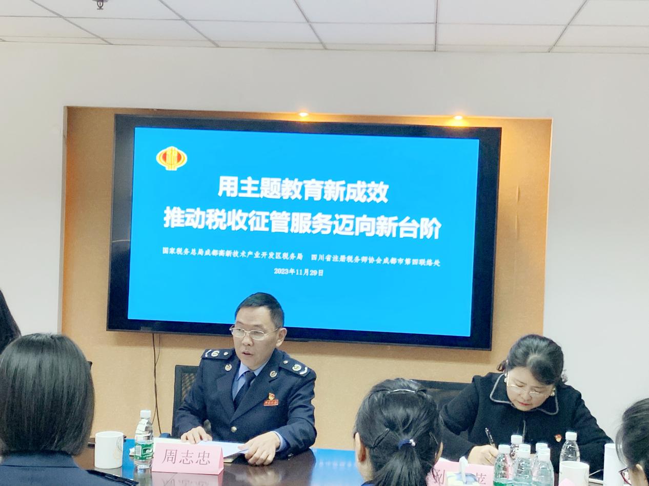 Zhou Zhizhong, based on the actual work of the Chengdu High tech Zone Taxation Bureau, introduced to the attendees the main work measures of the Chengdu High tech Zone Taxation Bureau during the second batch of theme education and the new challenges faced by tax collection and management services. He introduced that the Taxation Bureau of Chengdu High tech Zone firmly grasps the overall requirements of "learning ideology, strengthening party spirit, emphasizing practice, and building new achievements", organically integrating theoretical learning, investigation and research, promoting development, and inspection and rectification, and promoting the deepening and implementation of the second batch of theme education in a "fully qualified" state. It has made new breakthroughs in the process of smart tax construction and launched new measures in tax collection and management services. The Taxation Bureau of the High tech Zone has expanded the application of innovative achievements in digital and intelligent empowerment, launched AI intelligent empowerment tools for digital and electric bills, created an intelligent appointment and pre inspection "two end one interaction" construction model, explored the application of high-tech zone government service "blockchain" technology, innovatively improved the mechanism of demand response, and created a "one kilometer service circle" for social security payment.