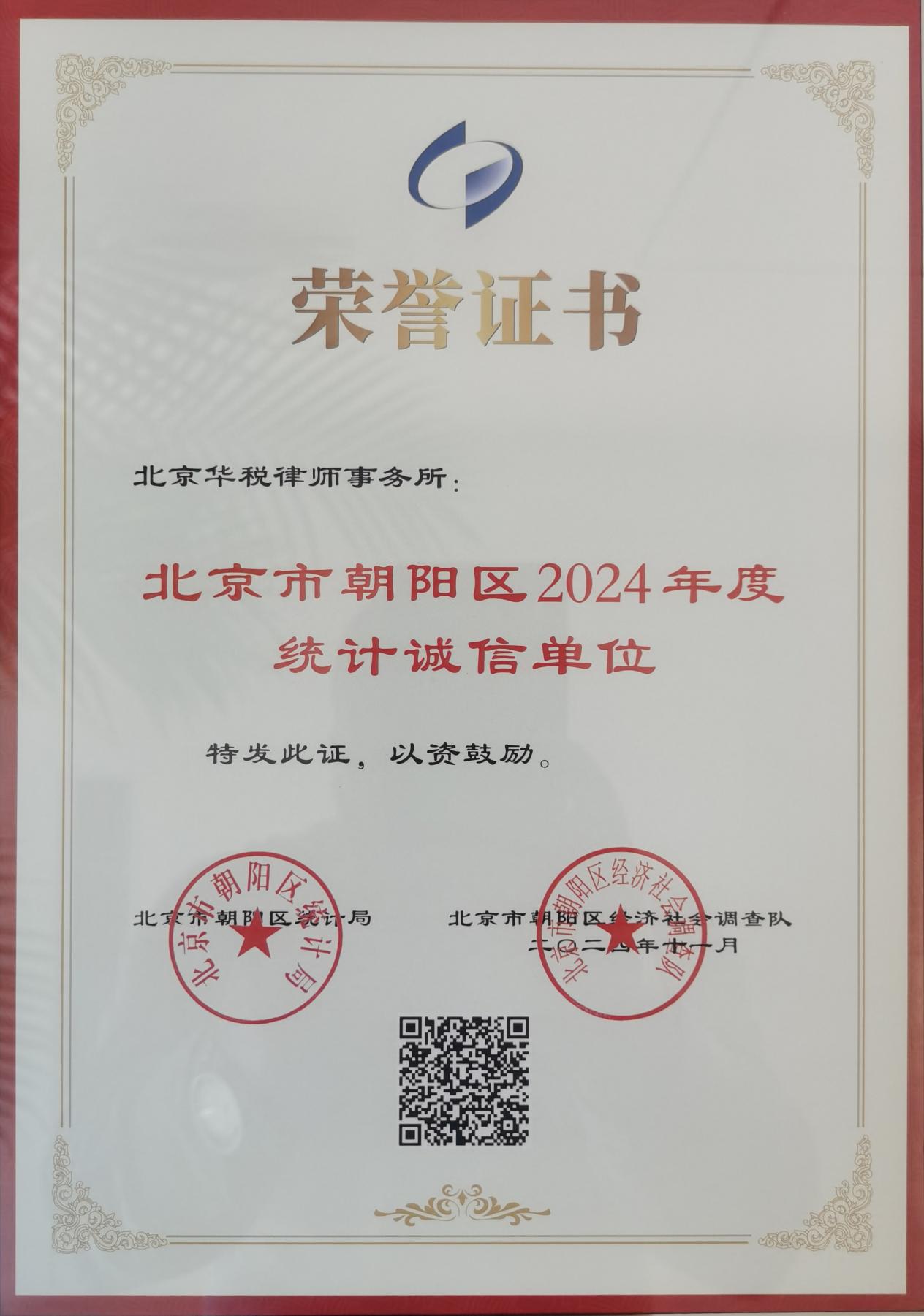 To adhere to the social credit system requirements set by Beijing and Chaoyang District, and to advance the development of a creditable statistical system, enhancing the accuracy and excellence of statistical data and services, the Chaoyang District Bureau of Statistics and the Chaoyang District Economic and Social Survey Team initiated the Statistical Integrity Enterprise Selection Program in 2022. The selection process rigorously evaluated candidates based on foundational work, data accuracy, and compliance with administrative regulations. Recently, the 2024 honorees were announced, with Beijing Hwuason Law Firm being bestowed the title of "2024 Beijing Chaoyang District Statistical Integrity Enterprises"receiving high recognition from the Chaoyang District Government.