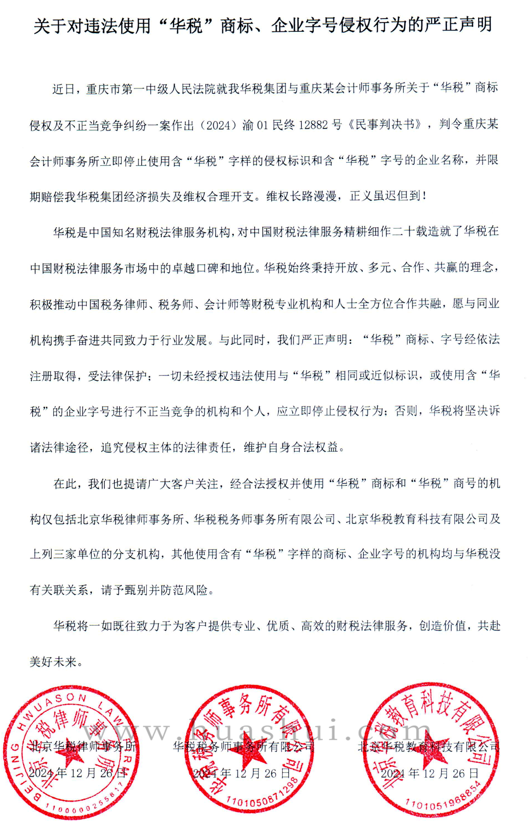 Serious Statement on Prohibition of “Huashui” Trademark and Trade-name Infringement