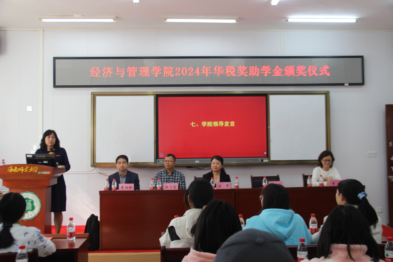 On the afternoon of January 3, 2025, Sun Ping, the chairman of Huashui Taxation Firm (Haikou) Co., LTD. (hereinafter referred to as: Huashui Haikou Company), along with Deputy General Managers Wang Ningxian and Jia Ying, were invited by the Business School of Hainan Normal University to award 20 students who received the Huashui Scholarship and Financial Aid. Lu Na, the deputy secretary of the Business School of Hainan Normal University, attended the award ceremony, which was presided over by Professor Cao Shengxin from the Taxation Department.