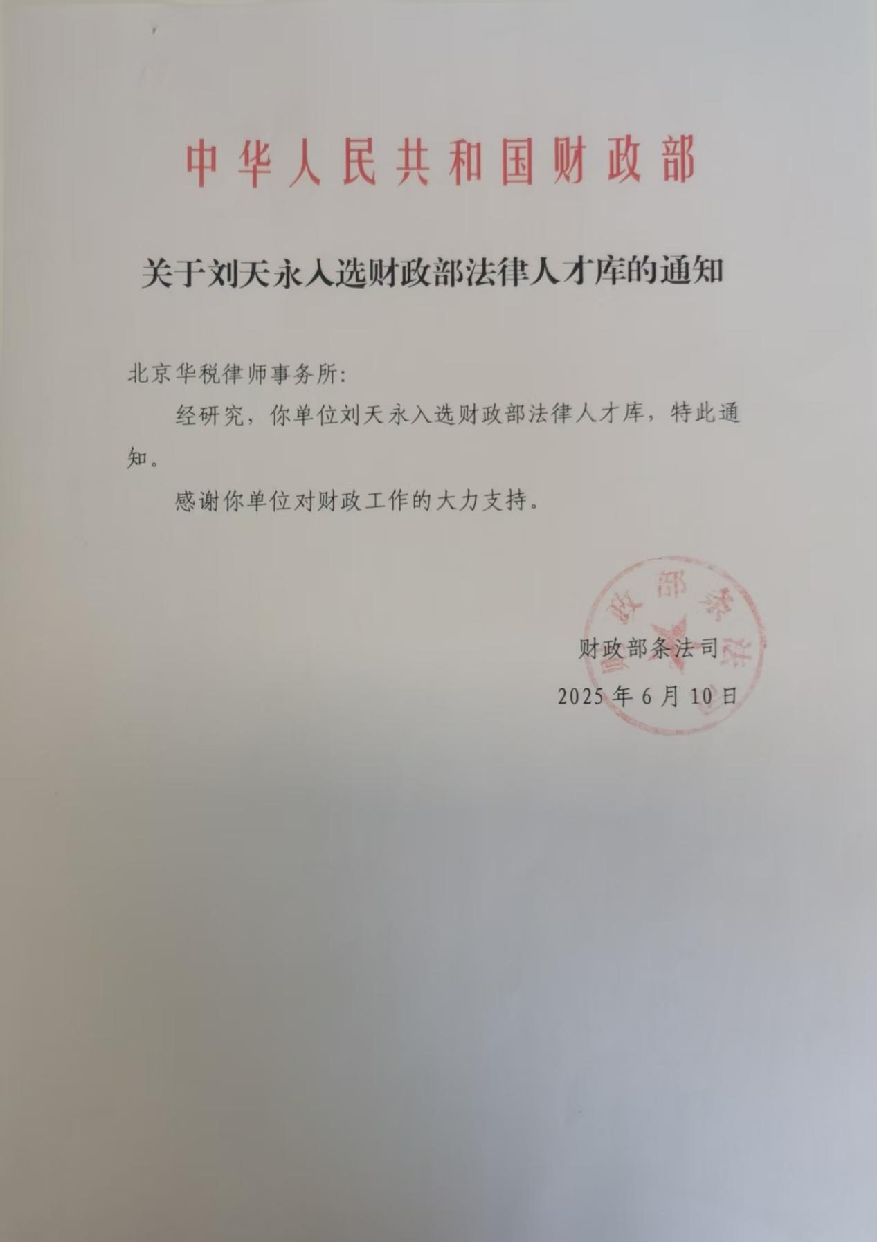 In June 2025, lawyer Liu Tianyong, the director of Hwuason Law Firm, was selected into the legal talent pool of the Ministry of Finance. This was the second time that lawyer Liu Tianyong was selected into the first batch of financial talent pool (legal talent pool) of the Ministry of Finance in December 2020. It is reported that the establishment of the financial talent pool of the Ministry of Finance aims to speed up the construction of a high-quality professional financial talent team, gather outstanding talents to fully serve the financial reform and development, and provide strong talent support for the high-quality development of the financial cause.