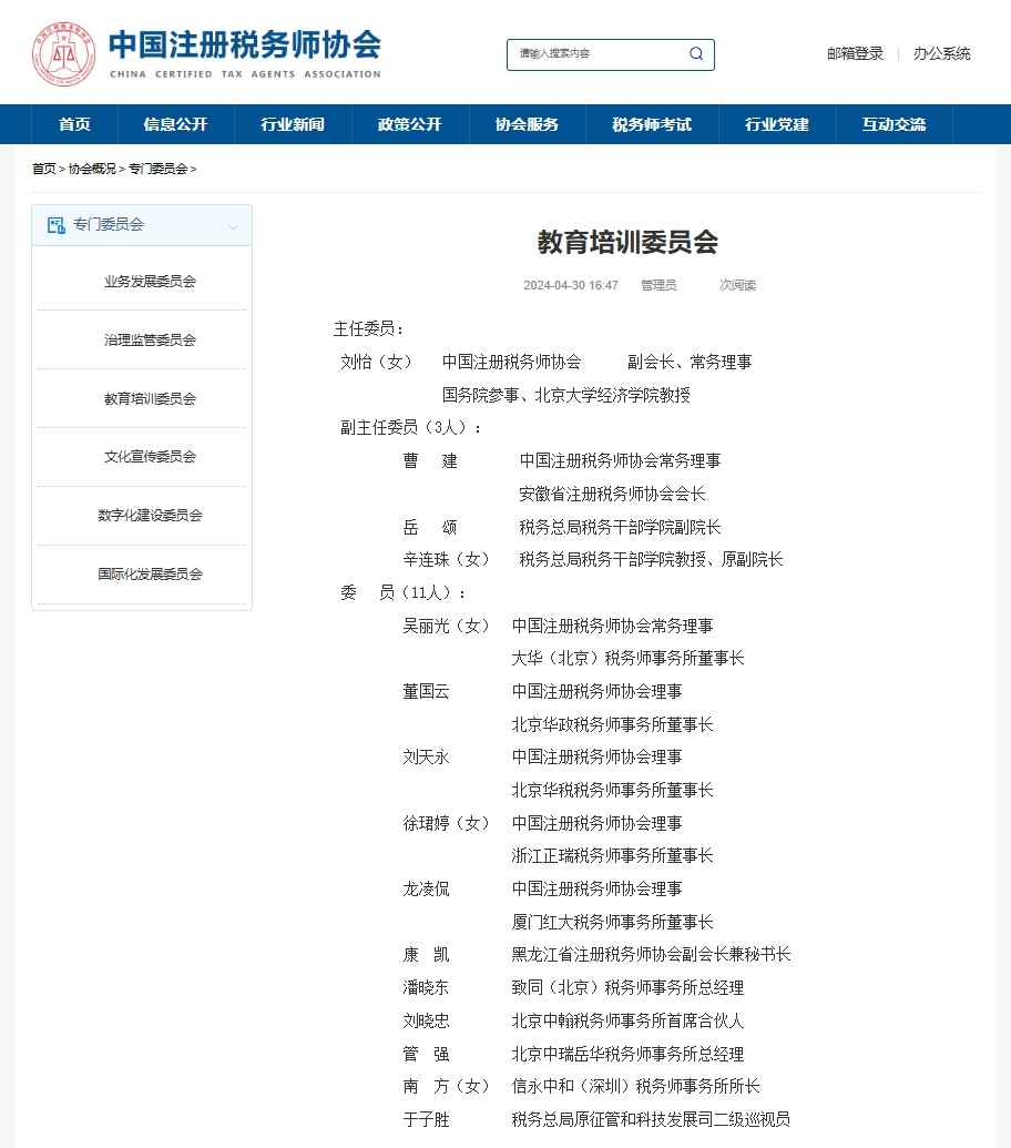 Recently, the China Certified Tax Agents Association (hereinafter referred to as "CCTAA") issued the "Notice on Adjusting the Organizational Structure and Personnel Composition of the Specialized Committees" (CCTAA Secretarial Issuance [2024] No. 24). After deliberation by the second office meeting of the seventh council of CCTAA, it was decided to adjust the organizational structure and personnel composition of the specialized committees of CCTAA, consolidating the current eight specialized committees into six, including: Business Development Committee, Governance and Regulatory Committee, Education and Training Committee, Cultural Promotion Committee, Digital Construction Committee, and International Development Committee. A total of 88 individuals were elected as members of the new committee.