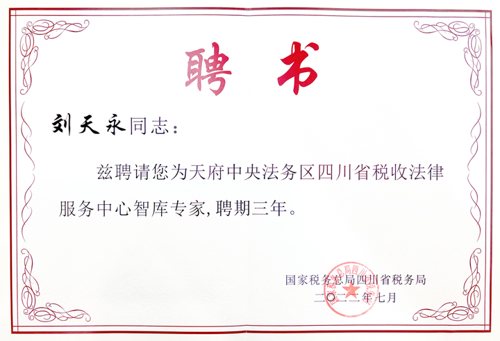 Last July, the Tax Legal Service Center of the Tianfu Central Legal Affairs Area was officially established through collaborative efforts from the State Administration of Taxation Sichuan Provincial Taxation Bureau, Chengdu Municipal Taxation Bureau, and Tianfu New Area Taxation Bureau. In July 2022, Lawyer Liu Tianyong, the director of Hwuason Law Firm, was appointed as an expert in the think tank of the Sichuan Provincial Tax Legal Service Center by the State Administration of Taxation Sichuan Provincial Taxation Bureau.