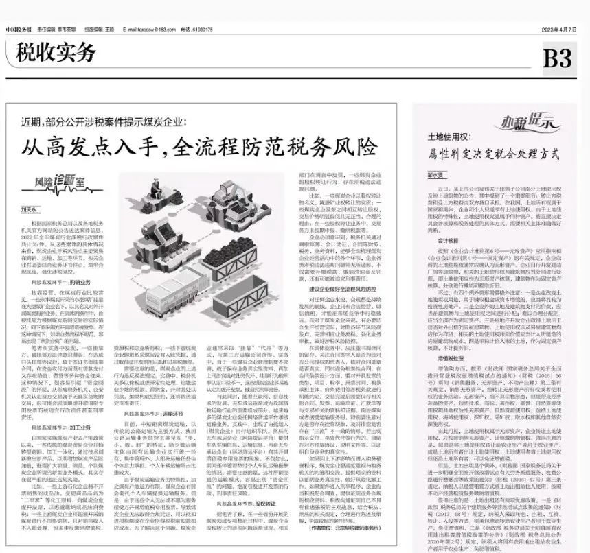 Recently, an article titled "Starting from High-Risk Points to Prevent Tax Risks Throughout the Entire Process" written by Liu Tianyong, Director of Hwuason Law Firm and Director of the Financial and Tax Law Professional Committee of the All China Lawyers Association, was published in "China Taxation News" as part of a commissioned contribution. This article, based on recent relevant cases handled by Huashui, focuses on analyzing tax risks in the areas of procurement, sales, transportation, processing, and equity transfer within the coal industry. The article provides recommendations for companies to strengthen risk prevention and control throughout their operational processes.