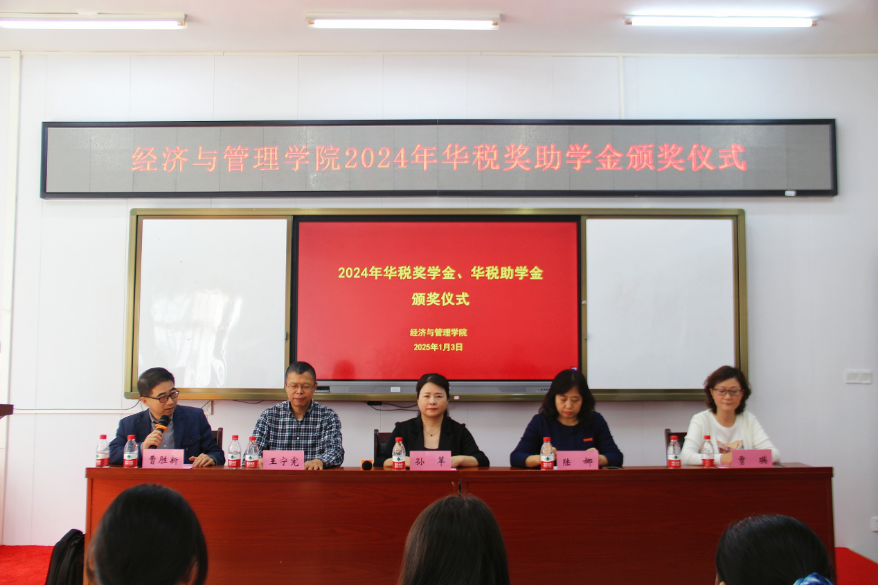 On the afternoon of January 3, 2025, Sun Ping, the chairman of Huashui Taxation Firm (Haikou) Co., LTD. (hereinafter referred to as: Huashui Haikou Company), along with Deputy General Managers Wang Ningxian and Jia Ying, were invited by the Business School of Hainan Normal University to award 20 students who received the Huashui Scholarship and Financial Aid. Lu Na, the deputy secretary of the Business School of Hainan Normal University, attended the award ceremony, which was presided over by Professor Cao Shengxin from the Taxation Department.
