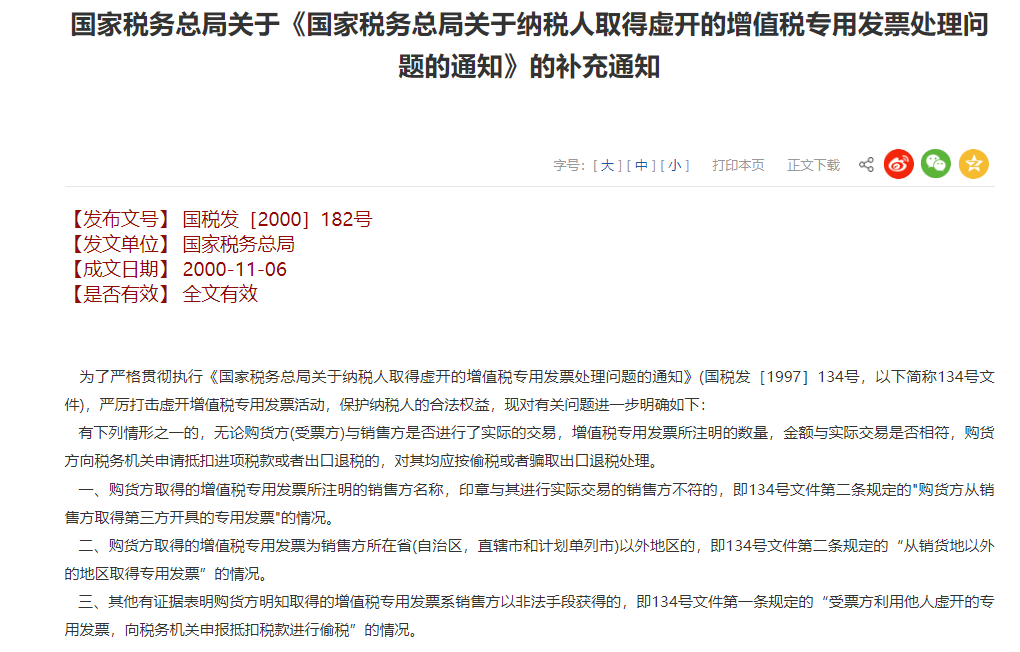 The 1990’s, China was still in the era of manual invoicing. Enterprises first needed to apply with the tax authorities with proof documents. After approval by the tax authorities, they could purchase a certain number and amount of blank value-added tax special invoices. After the enterprise has a sales business, it can manually fill in the invoice externally. Since the information on the blank invoice is very simple, only the province, code, and the seal of the selling tax authority, including the name of the seller, can be manually filled in. This means that the blank value-added tax special invoice purchased by one company can still be handed over to other companies for use. At the same time, the invoice purchase process was inconvenient, and the quota was strictly limited. Some enterprises were hindered by the complexity of the approval process. In order to facilitate the purchase of invoices from tax authorities, they purchased blank VAT special invoices from other enterprises. Some enterprises were unable to meet their business needs due to the invoice quota. They also choose to purchase blank value-added tax special invoices from other companies, resulting in some shell enterprises engaged in the reselling of blank value-added tax special invoices. Some even illegally print value-added tax special invoices and then resell them, seriously disrupting the order of invoice management. At that time, there was still a lack of unified and clear national regulations on whether the illegal purchase of blank VAT special invoices and the illegal purchase of forged or altered VAT special invoices and then filling in them were considered false invoices and how to handle them. In this case, On November 6, 2000, the State Administration of Taxation issued a supplementary notice on the "Notice of the State Administration of Taxation on the Handling of Taxpayers Obtaining Falsely Issued Value-added Tax Special Invoices" (Guo Shui Fa [2000] No. 182), which clarified the relevant issues.
