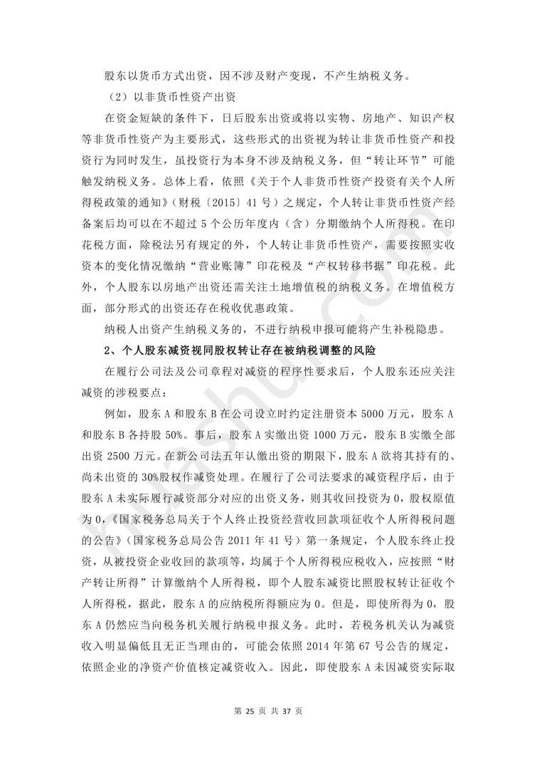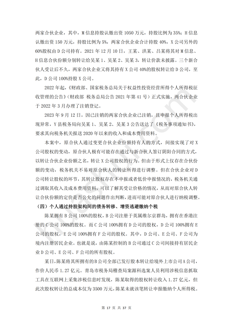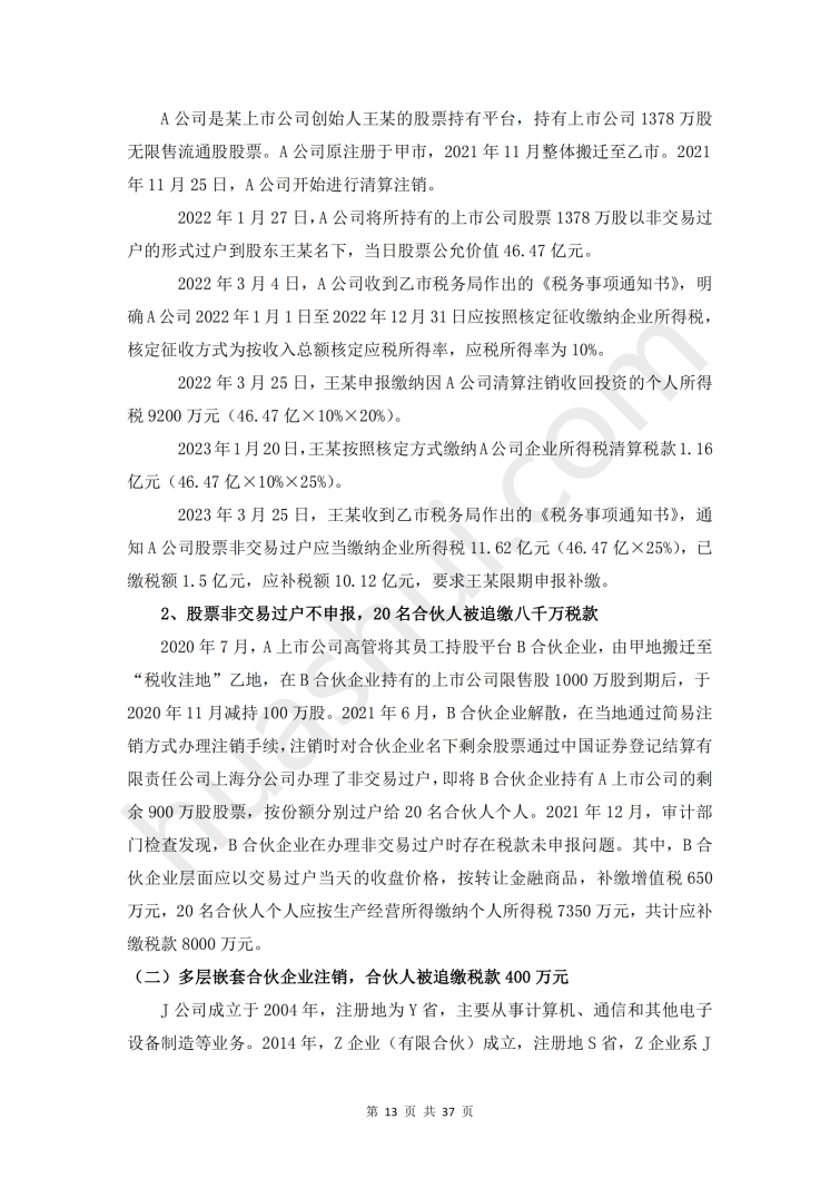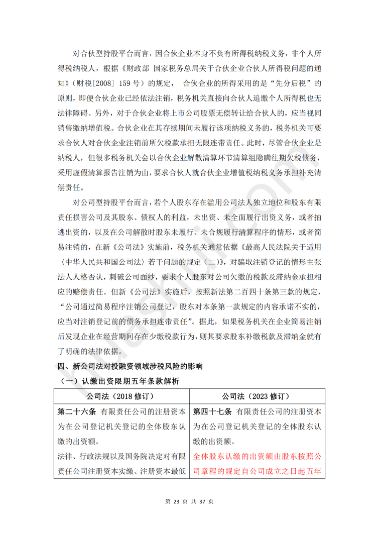 Along with China's economic development, the investment capacity of high net worth individuals (HNWIs) in Mainland China has strengthened. According to the China Private Wealth Report released by China Merchants Bank in 2023, as of 2022, the number of HNWIs in China reached 3.16 million, holding a total of RMB 101 trillion in investable assets, and corporate equity investment is also one of the main directions of HNWIs' cash outflow. However, direct shareholding by natural persons has a high tax burden, and individual investors are exploring other shareholding modes in order to reduce their tax burden. At this time, the shareholding platform, as a shareholding structure designed under the combined effect of local tax incentives and the stability of listed companies' shareholdings, has entered the vision of HNWIs and become an important tool for HNWIs' foreign investment. In recent years, with the tightening of tax regulation for HNWIs and the extensive and in-depth cleanup of local tax approvals and financial rebate policies for irregularities, the tax advantage of the shareholding platform is no longer available, and if the shareholding platform is not dismantled, it will face the situation that the tax burden for future equity transfers will not be reduced but rather increased, while the dismantling of the shareholding platform may immediately be burdened with a high level of tax. At the same time, HNWIs and their equity transfer behaviors have become an area of continuous attention and key investigation by tax supervision, and it has become a dilemma for HNWIs to dismantle or not to dismantle their shareholding platforms. In practice, it has been common for individual investors to dismantle their shareholding platforms, among which, the most common means of dismantling the shareholding platforms for HNWIs is to cancel the non-trading transfers of shares. However, this approach has also brought a lot of tax risks to HNWIs, which is evidenced by the cases of various back taxes and late payment liabilities penetrating into the shareholders and partners. In addition, the promulgation of the new company law on December 29, 2023 also has potential tax implications for individual investors through amendments to various aspects such as registered capital, governance structure, principal liability and establishment and exit.